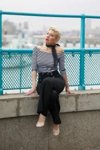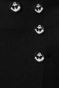 These 40s Stay Awhile Trousers in Black are inspired on the trousers that those progressive women in the 40s / 50s wore! The high waist forms a beautiful contrast with the wide leg and is very flattering, also with fuller hips/bottom. The faux anchor buttons give it a sailor touch and finish it off perfectly. Made from a supple fabric with a light stretch in a classy black colour for a lovely fit. We like sailors but LOVE the sailor style!