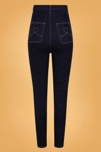 Show off your curves in these 50s Lulu Skinny Jeans in Navy! This curve-hugging, high waist denim beauty will accentuate your best features! Made of a stunning, dark-blue cotton blend with a light stretch making her a joy to wear, finished off with copper-coloured buttons and contrast stitching for an authentic touch. Pair Lulu with high heels or sneakers for a feminine but cool look and let your hot curves take centre stage!