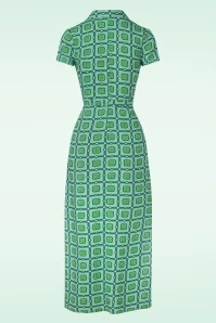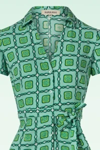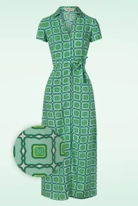 Create a colourful summer look with this Daria Maxi Shirt Dress in Light Blue and Green! Styled with a V-neck with a pointy collar, a handy row of buttons, short sleeves and a waist-defining tie belt. Made of a supple, non-stretchy (100%) viscose that features a gorgeous retro print in various shades of blue and green and that is a joy to wear. Dare to wear Daria?