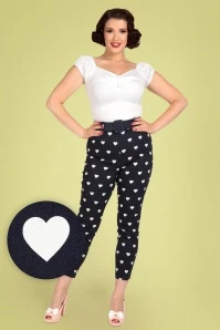 “Ahoy, Me Hearties!” These Emmie Heart Cigarette Trousers in Navy are a real wardrobe essential! The high waist with a detachable waist belt creates a super feminine silhouette. Made of a supple, navy-blue cotton blend scattered with white hearts that incorporates just a hint of stretch for a surprisingly comfy fit. Pair with a blouse and high heels or even with a T-shirt and trainers…Emmie is always a great choice!