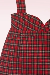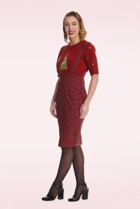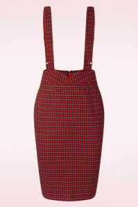 ‘Tartan-tastic!’ This high-waist skirt is styled with adjustable suspender braces and made of a firm, stretchy, deep-red fabric in a classic tartan check design.